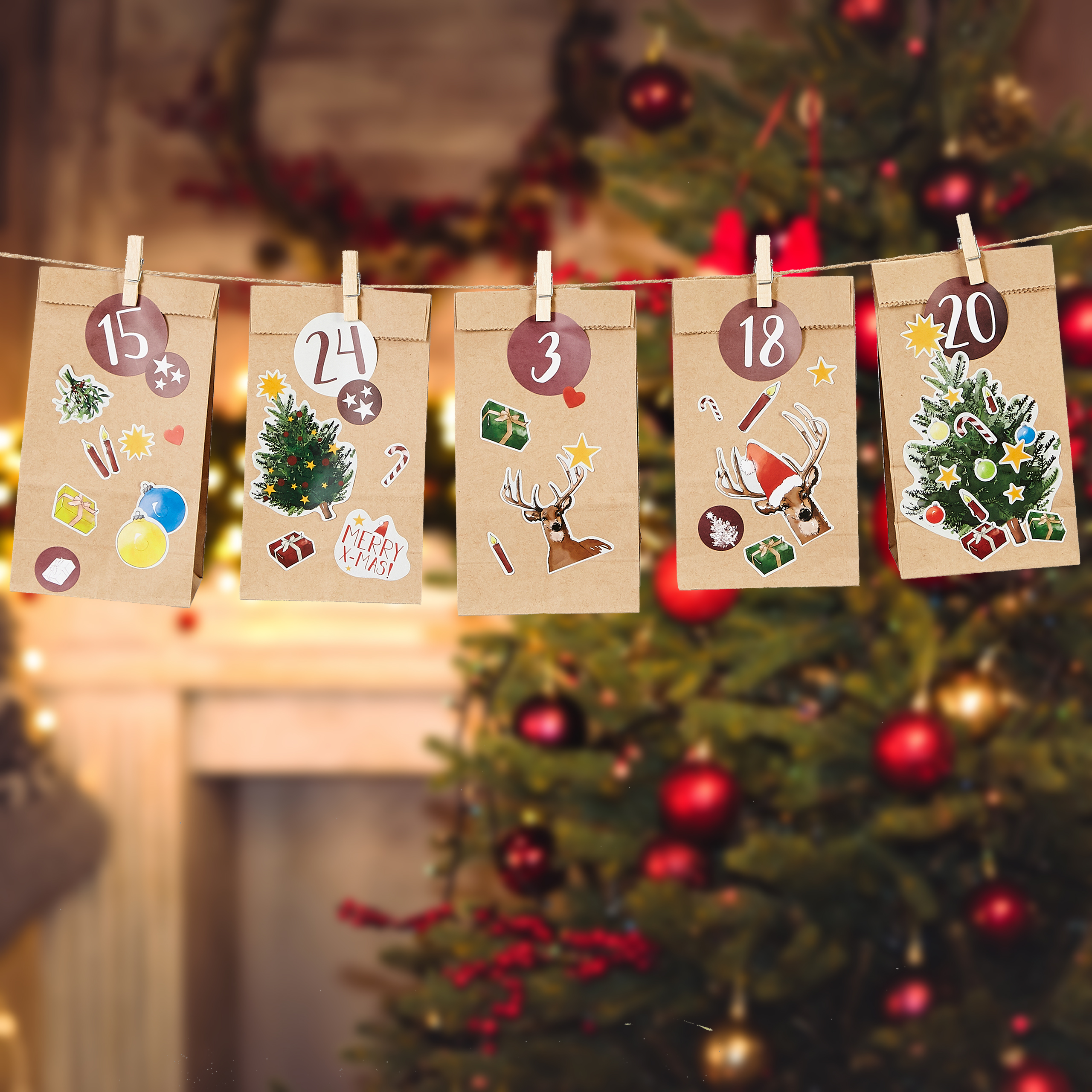Our beautiful Advent calendar set to fill yourself accompanies you through the festive Advent season. It contains 24 paper bags, an 8m long jute string to hang up, small wooden clips and lovely stickers with Christmas illustrations and numbers for individual design.